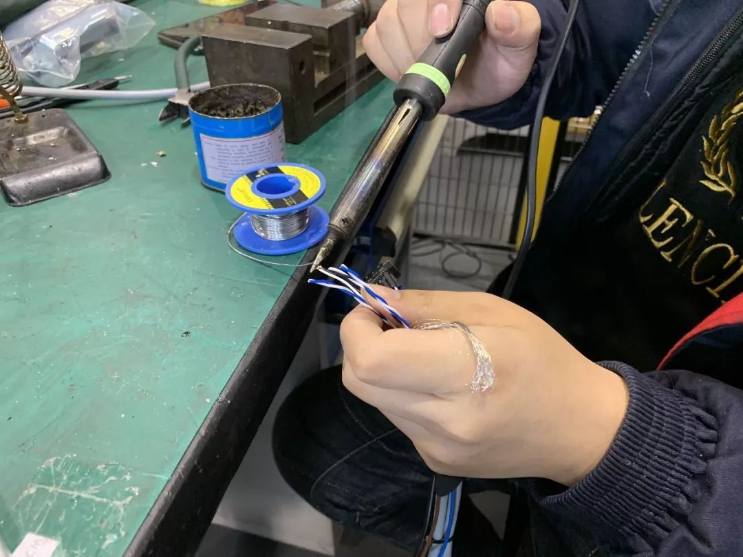 針對不同伺服電機功率的大小,生產人員選擇相應線徑的線纜和制作工藝。了解電氣設計工程師提供的客戶現場的情況,選擇線纜的長度,確認機架與電控柜線纜之間的連接方式,根據圖紙進行接線、焊線等工作,焊線時,焊點要平滑,不要焊連,保證相應點位焊接牢固,必要的地方要套上熱縮管,打上熱熔膠,防止點位之間短路或銅絲,屏蔽線外露,線纜脫落,以達到保護焊點,保證設備安全運行,焊接完成后,還要檢測線纜是否焊牢,相序是否正確,同時要用標簽紙區分電機線纜軸號和連接位置。